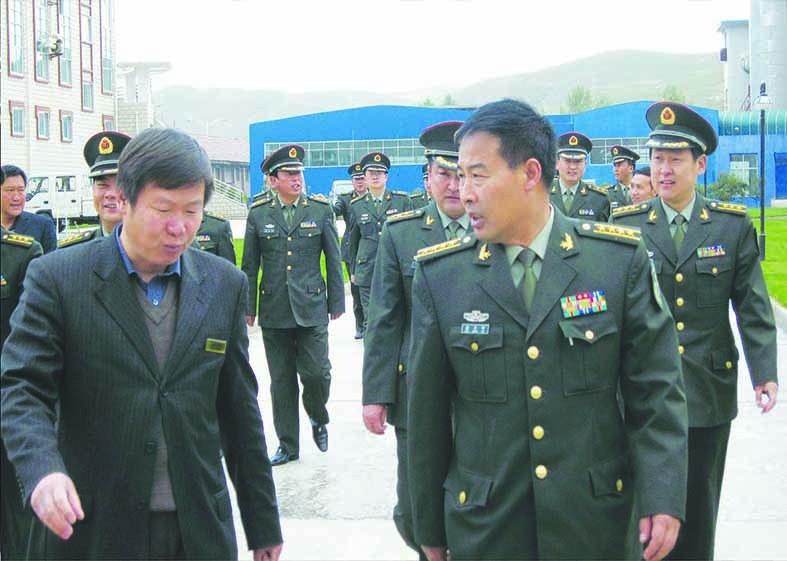 甘南軍分區(qū)政委郭全印(右)視察華羚公司