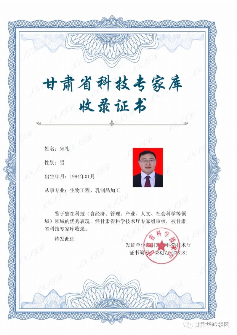 近日,甘肅華羚乳品股份有限公司技術中心副高級工程師、經理、甘南牦牛乳研究院專家宋禮同志經甘肅省科學技術廳專家組審核,被甘肅省科技專家庫收錄。