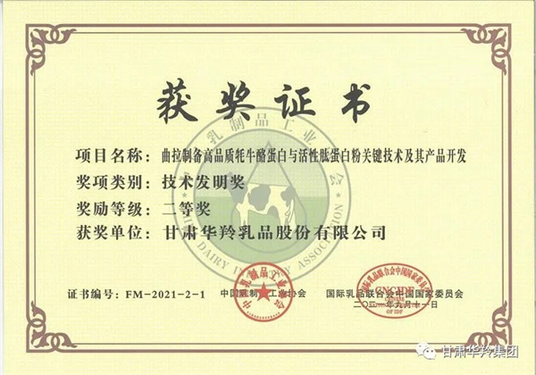 由甘肅華羚乳品股份有限公司研發團隊自主研發的曲拉制備高品質牦牛酪蛋白與活性肽蛋白粉關鍵技術及其產品開發項目經中國乳制品工業協會、國際乳品聯合會中國國家委員會聯合評審認定,在2021年度中國乳業科技系列獎項頒獎慶典上榮獲技術發明二等獎。
